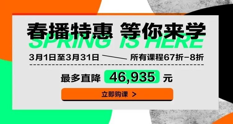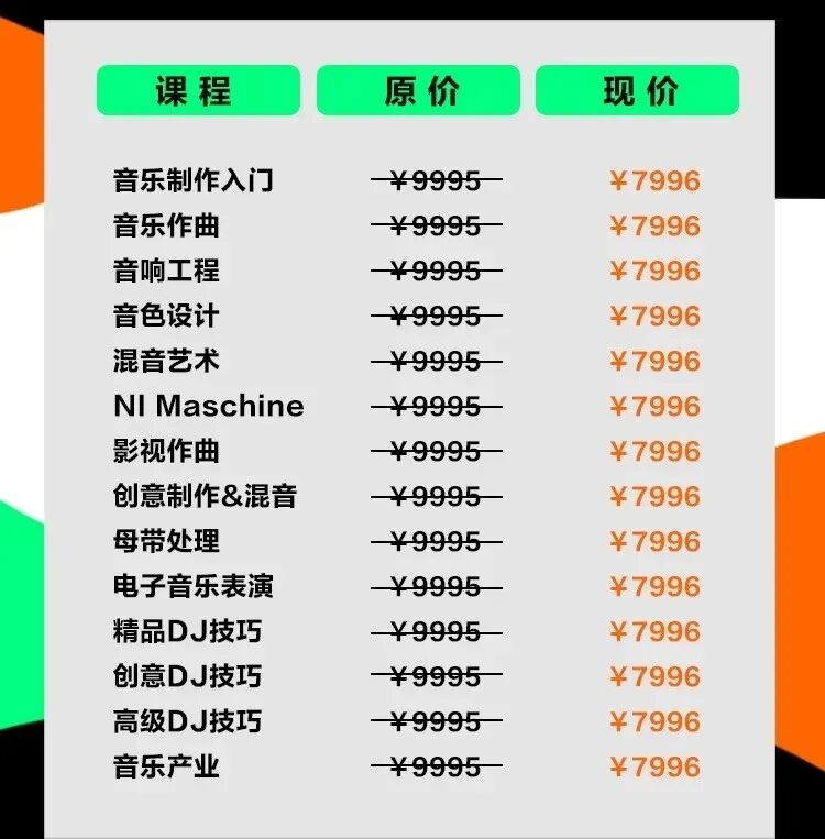⑵ 整月订课折扣:所有课程在3月预定享6.7折至8折优惠,最高降价空间高达46935元。这些折扣的课程包含与国际著名电音制作学院POINT BLANK同步标准的音乐制作、作曲、音响工程、音色设计、混音、母带、创意、NI Maschine设备课、Live Set、打碟、音乐产业知识&理论等。