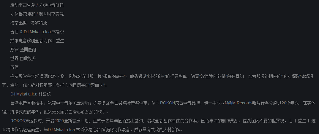 时隔多年,就在发文今日(2020年4月24日),我们的OG伍佰再度踏足电子音乐领域,与DJ Mykal a.k.a.林哲仪Collab新创作,这次是一首Original Mix——《重生》。除了伍佰的词曲唱以外,伍佰更与DJ Mykal a.k.a.林哲仪联手共同完成唱片制作、编排。