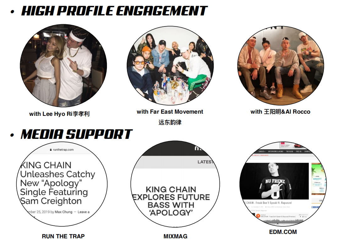KINGCHAIN的第一张录音室EP将包含三首单曲、三个MV、五组Feat艺人(均为知名Rapper和Singer)、艺人阵容自带超过60万粉丝。如果你对KINGCHAIN的完整EP感兴趣,别忘了在各个平台上关注他,其它新曲目已经提上排期了。