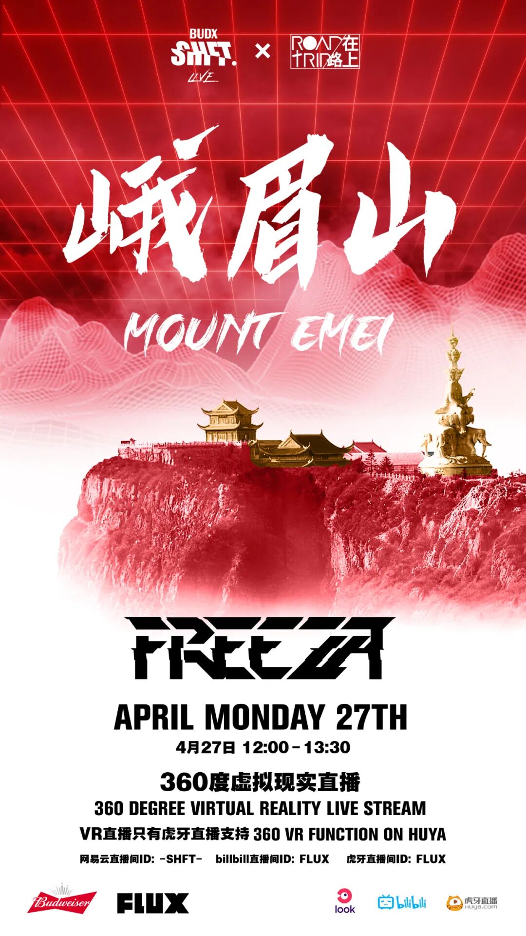 本次直播将由SHFT签约艺人、Dark Glitch-Hop的国内代表人物之一FREEZA作为表演者,在下周一(即2020年4月27日)12:00至13:30的峨眉山巅进行。SHFT和FLUX将在虎牙直播、网易云音乐旗下Look直播、bilibili直播献上“重彩”,刷新你的直播和VR在线体验。