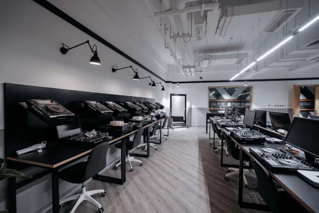 在线下,他们拥有齐全的设备构成的DJ教室;有专门的音乐制作工作室提供给学员上手使用;有专门的混音和录音工作室结合理论与硬件实践;有声学乐器录音棚,跳出纯电子范畴;有音乐制作教室能够让学员们在课堂间同时实操;人性化地提供了环境优良的休息室。