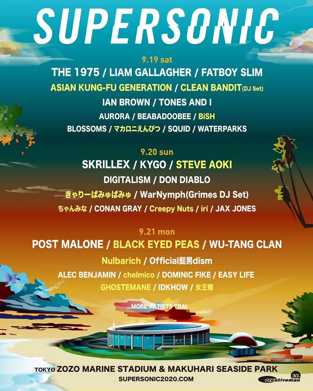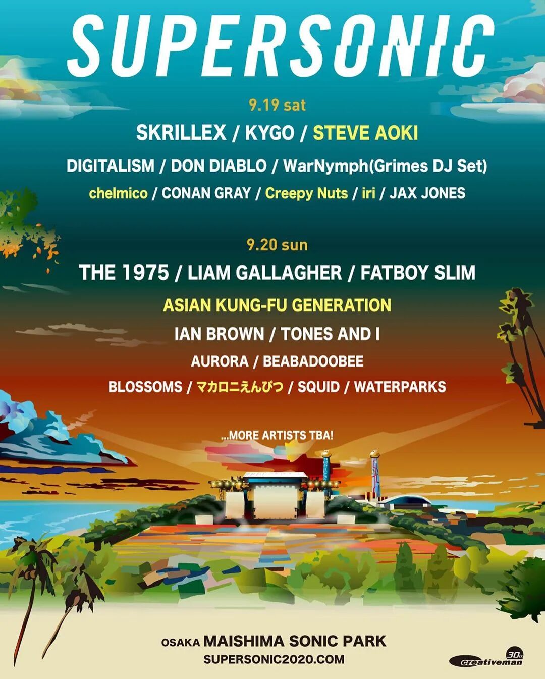 SUMMER SONIC子音乐节SUPER SONIC将在日本的两座城市举办,分别是日本东京和日本大阪,前者举办于2020年9月19日至21日(三天)、后者举办于2020年9月19日至20日(两天)。据说现有的表演阵容还不算全部,更多来自各国的巨星将在后续揭晓。