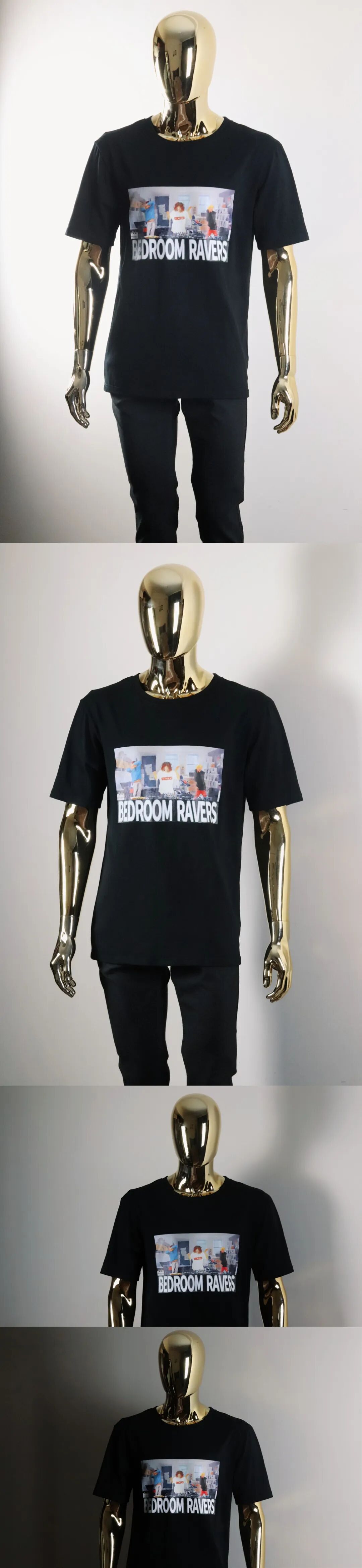 就在昨晚,我们还“请”到了自家的金色工具人(我们觉得模特道具这个词不够有灵气,它真的太贴合工具人的说法了)上身本款周边,以四种截然不同的打光角度,通过既经典又未来的方式展现了「BEDROOM RAVERS」主题短袖T恤的着身效果,总觉得有股AI味。