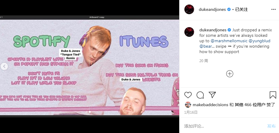 组合成员Luke:从我们试图为这个项目命名时,我们就必须搞清楚这是一个双人组,它会包含两个人,类似于Chase & Status,他们是我们特别佩服的英国人。另外,我们很喜欢“&”这个符号的外观。Isaac的父亲曾出于某种原因把我叫作Duke,所以我们干脆就用Duke作为组合名字的前面。而Jones和Luke搭配在一起好像很不错,除了这以外没有额外的意义。