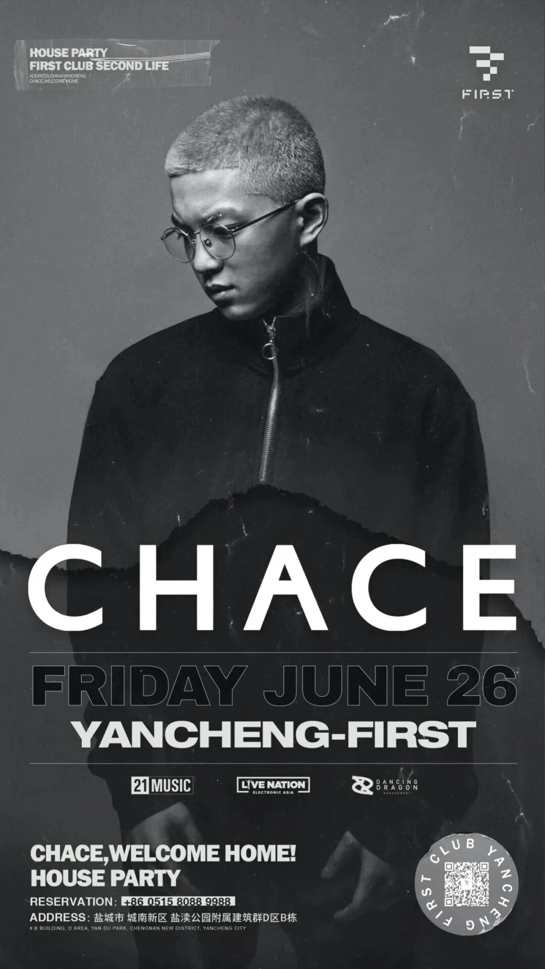 自开业以来,FIRST CLUB盐城店成功预订了诸多国内外知名DJ/制作人,使全国的“派对场”风貌在盐城席卷并且普及。本次,FIRST CLUB与Chace、Live Nation Asia、Dancing Dragon Management合作,也将成为一场将盐城的俱乐部画面推广向全国的House记录。