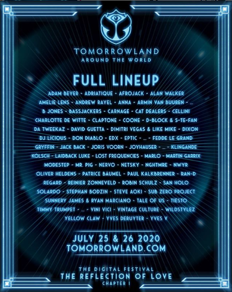 在以上述提及曲风的顶流DJ/制作人们构成的著名表演家们之余,Tomorrowland并没有把直播做成廉价的“家庭TV秀”。今年的Tomorrowland直播表演将设定为凭门票观赏的形式,并非向所有网友们免费展示,门票将于本周四欧洲中部夏令时间15:00发售。