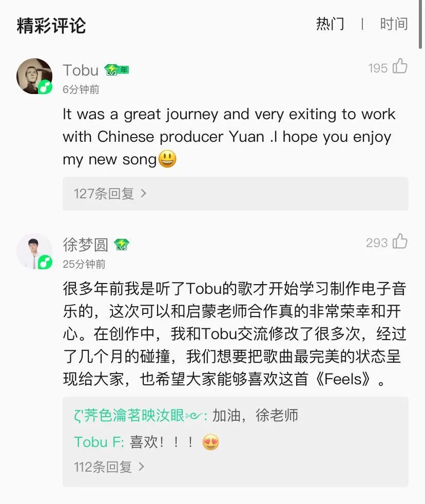 但看见音乐和Tobu不仅没有这么做,还颠覆了剧情和许多人的推测。在看见音乐为双方牵线下,徐梦圆和Tobu合作了!这不是一个都市传说。两人合作的最新单曲《Feels》已于2020年6月21日全球发行,依然是EDM“门派”下的Melodic House风格,两人熟悉的味道,且如往常般融入了中国乐器的软音源。