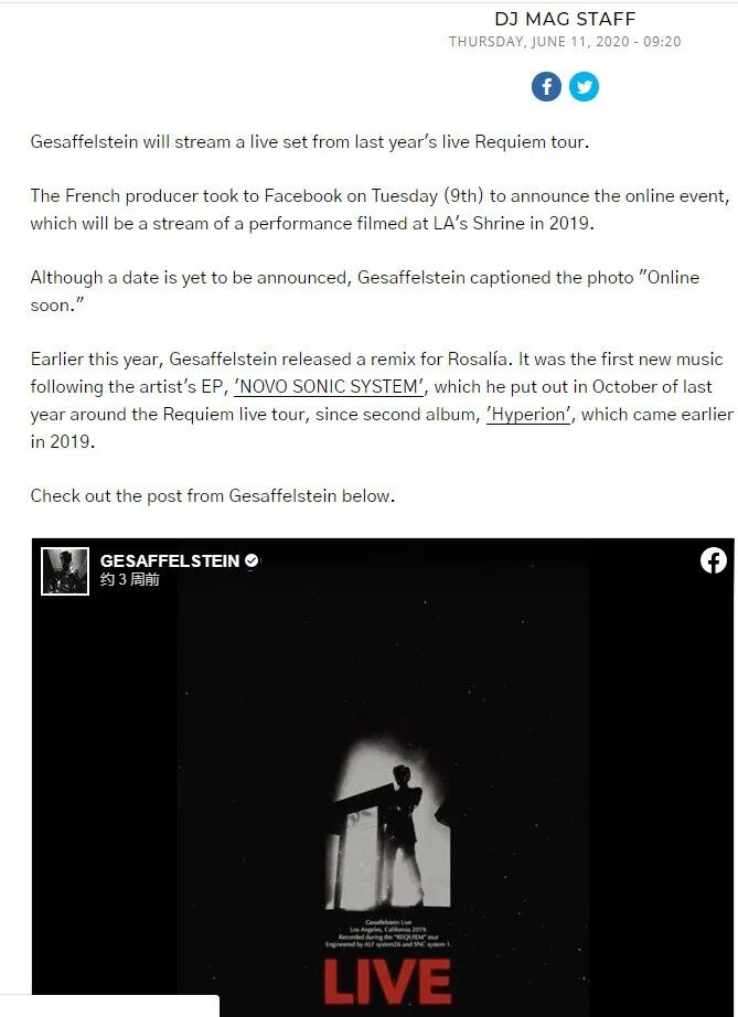 关于GESAFFELSTEIN的往事和更多介绍早已成为《电子音乐资讯》的旧话题,读者朋友们可在历史消息内自取。不过,就在2020年6月9月及其后续一周内,“GESAFFELSTEIN要进行直播了”的消息便在国内外的许多大小型媒体传播开,致以期待的国内外粉丝门庭若市。