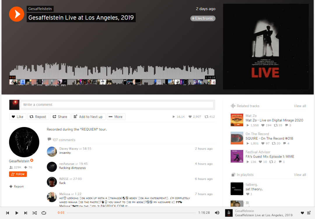 不过事情的真相却令很多人意外。6月26日,GESAFFELSTEIN发布了这个所谓的“Online”内容,对应的是他在2019年的《REQUIEM巡演》的洛杉矶站的Live Set录制音频。是的,这很巧妙。GESAFFELSTEIN说的只是“线上”,他并没有直接指向“直播”。