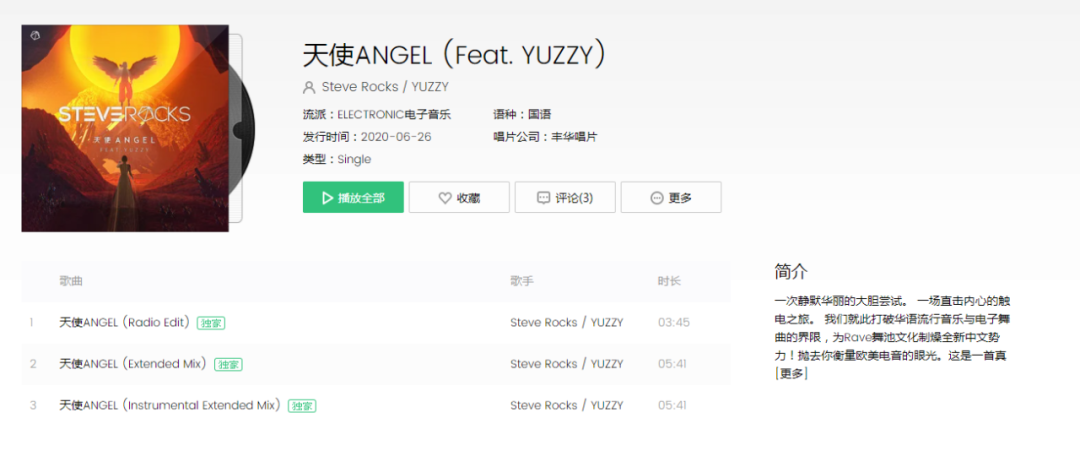 在Steve Rocks涉猎词曲创作、编排制作的全方位操刀下,Steve Rocks为今年的Progressive Trance个人生涯谱写了新篇章,大胆迈出了EDM格局。YUZZY的倾情投入又让这份原本就洋溢着Trance气质的词曲,发挥了与EDM Vocal不同的“传思”人声魅力。《天使ANGEL (Feat. YUZZY)》以EP形式赋予了腾讯音乐流媒体独家版权,EP内包含Radio Edit、Extended Mix、Instrumental Extended Mix三个版本号。如果你是一名DJ,Extended Mix可能更方便在夜店中使用,有更长的方便接歌的段落。
