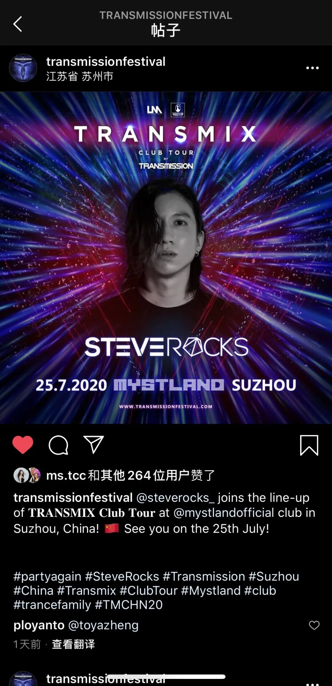 一天前,Transmission宣布了Transmix中国巡演项目在中国苏州的首站派对信息,截止自撰文时间已经官宣的表演者包括Calvin Z、Steve Rocks和Jason。其中Calvin Z、Steve Rocks和Transmission、MYSTLAND本身都在《电子音乐资讯》的历史消息中有过记载。