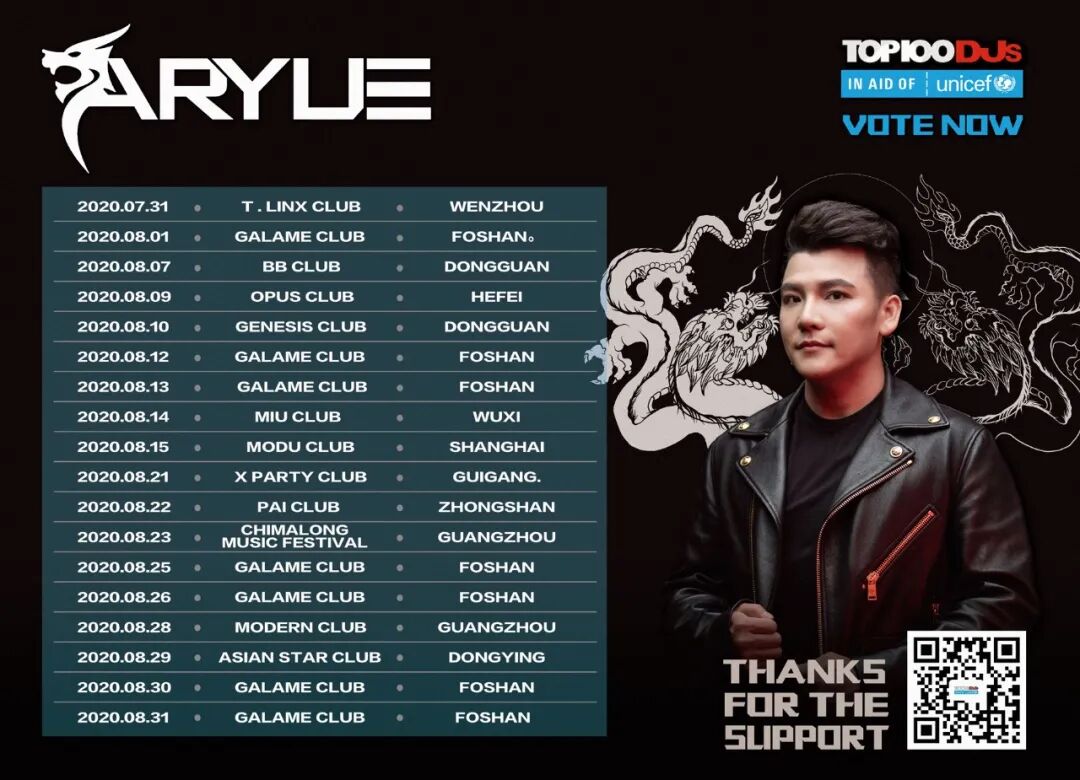作为一名DJ的时候,在演出经历、演出技巧和人气方面都相当娴熟的Aryue曾出现在UMF欧洲站、ADE以及其它的外国派对、音乐节舞台上,从欧洲到亚洲各国都留下了知名舞台印记。作为一名制作人的时候,Aryue和他创立的“龙厂”长期在Beatport登榜,在海外的音乐人气比在国内更高。