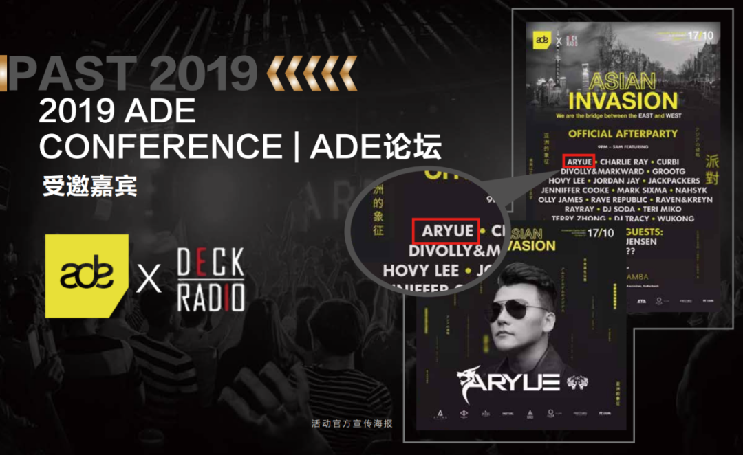 不过或许正是因为以上国际贡献,Aryue还很受海外主办方的欢迎,除了每年都会到海俱乐部去演出几次以外,Aryue更是曾经在Ultra欧洲站的UMF Radio舞台、ADE荷兰盛会的Asian Invasion派对上表演。总的来说,也算是DJ和制作人双身份都有些全球造诣了。