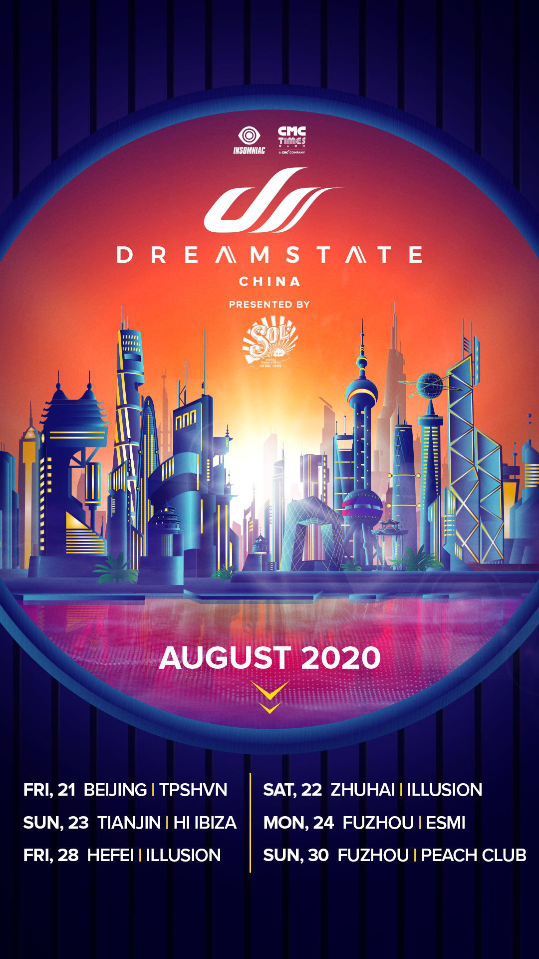 SOL携手Dreamstate中国巡演给大家传递出这样的讯息: 品:SOL阳光啤酒纯正麦芽香气带来的极致清爽口感; 听:顶级国际音乐节、派对品牌Insomniac旗下的IP Dreamstate甄选出的新锐DJ带来的Trance音乐; 玩:与追光使者和Gogo Dancer、A组、B组一道点燃心跳、逐日狂欢、尽享阳光; 感:引流都市潮人发掘内心阳光与正能量,在多元化的热力氛围塑造出激情澎湃、青春飞扬的自我。