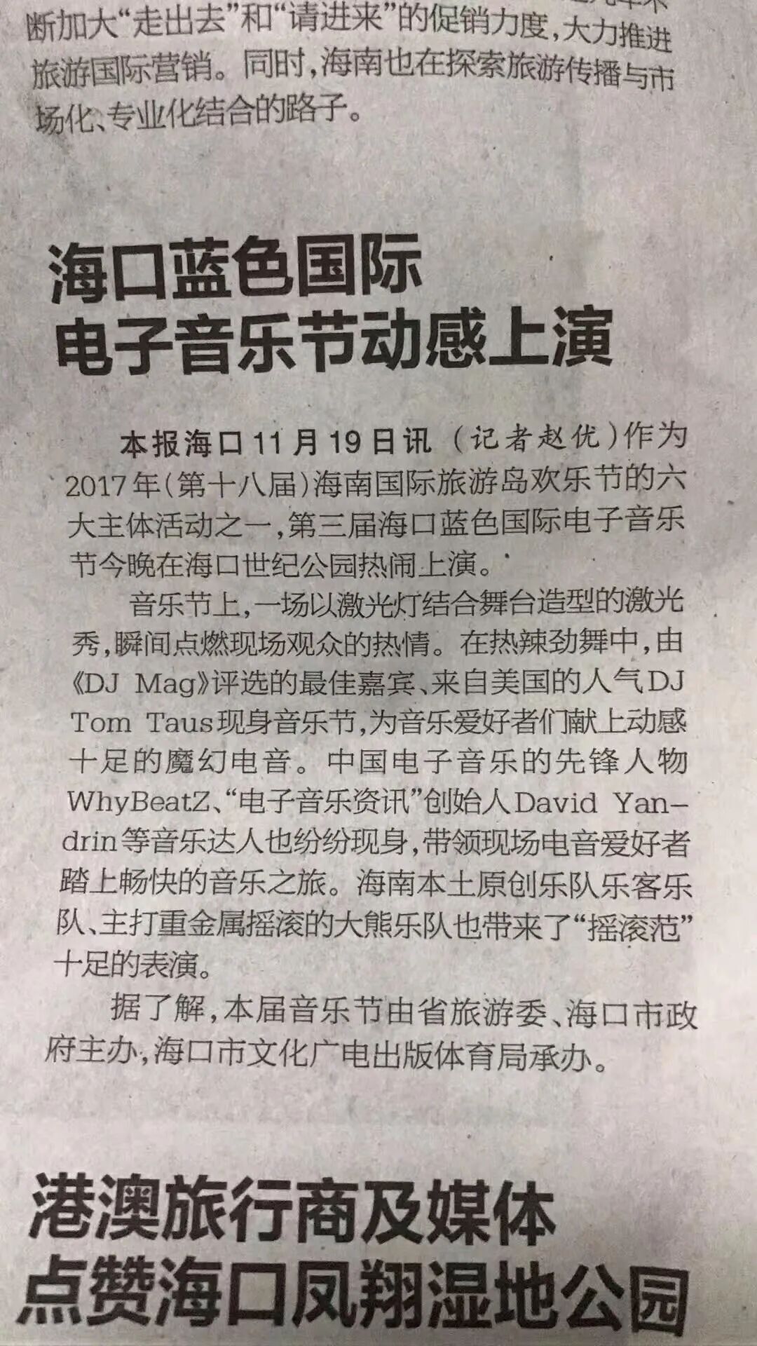 海口蓝色国际电子音乐节则由当地旅游局及当地市ZF举办,在包括但不限于报纸的传统媒介、电视台中都形成了有效的覆盖。
