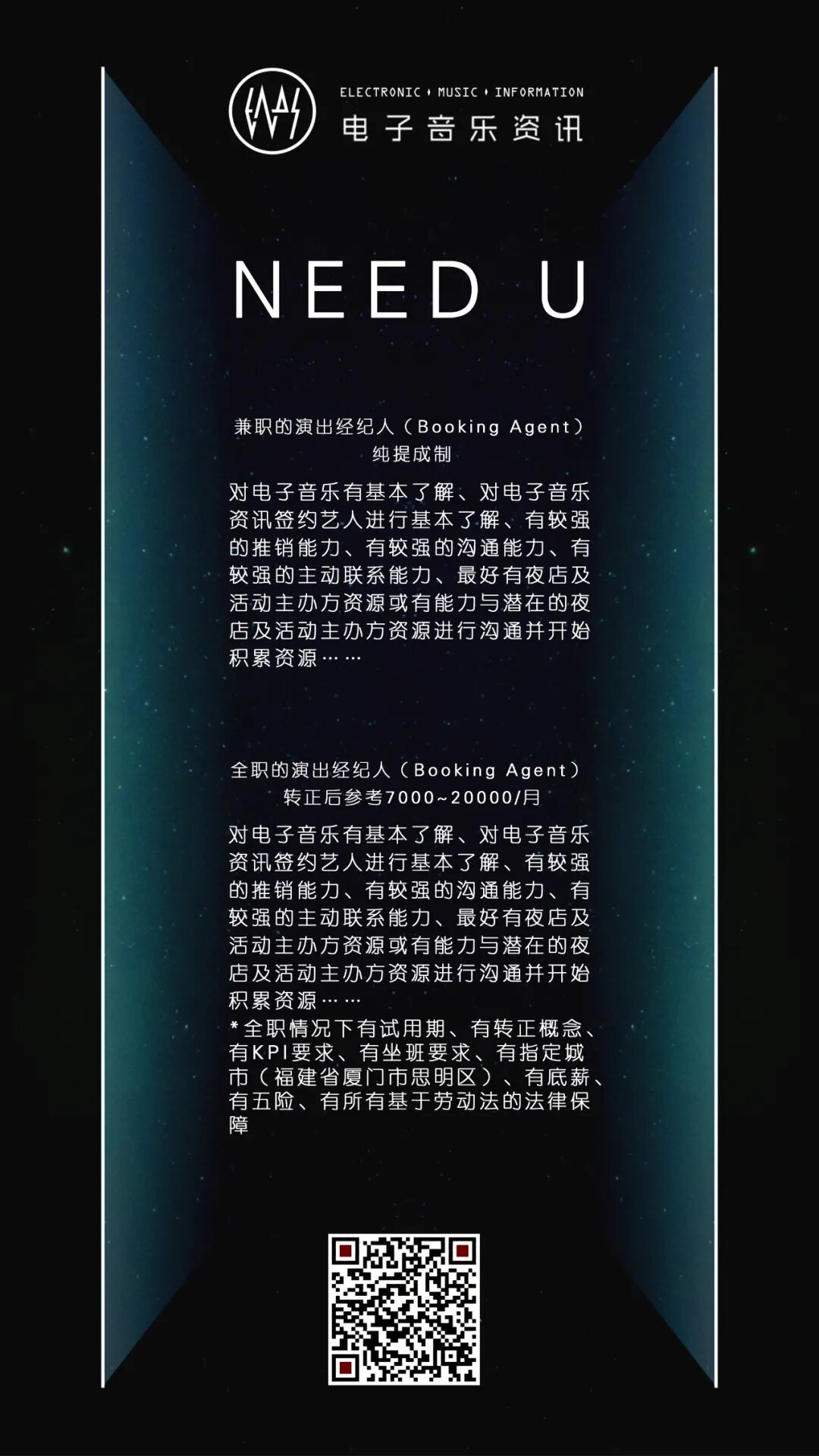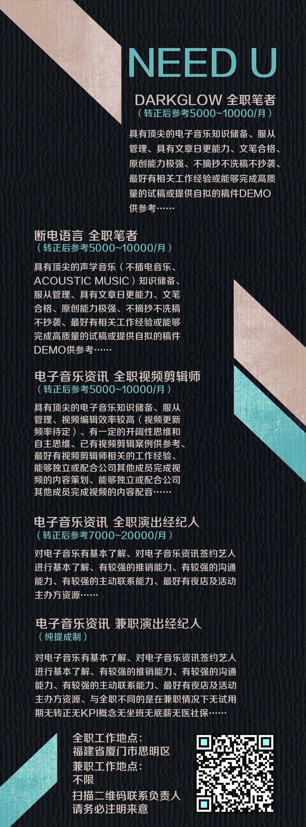 关于「电子音乐资讯」品牌的「视频剪辑师」的招聘公告(2020-10-17更新,以最新版为时效性标准):⒈电子音乐相关的知识储备依然最为重要。你的电子音乐相关知识储备将直接影响到你对视频素材(图片、视频等)的搜集和剪辑时的想法;⒉服从管理。人员管理与艺人管理一样重要。不愿意服从管理的同事就如同不愿意服从管理的艺人一样,合作不会太愉快;⒊将以全职岗位进行工作。音乐行业绝对不是野鸡行业,你将享有固定的月薪和其它劳动法规定的合法福利(五险等)。关于全职岗位的其它一切条例均基于劳动法、拒绝违反劳动法,不一一赘述;⒎请提前准备好至少3个由你独立剪辑完成的视频作品作为参考;⒏请知悉,在视频不够令人满意的情况下,即使是全职工作人员也有可能被拒稿。修改更是难免的;⒐转正后的月薪区间大概在5000~10000元,允许根据个人能力而具体商议,任何升降的可能性都存在。这取决于你将为公司带来了什么。得到什么一定是一道公平的算法;⒑遵循劳动法的规定,这份工作会有两个月到三个月的试用期;⒒我们会尽量放出三个原创视频供参考,请视频剪辑师“老师”们留意并自评可否达标;⒓每天的上班时间为7个小时,12点上班,19点下班。我们充分考虑到了你的睡眠质量;⒔每周单休一天,也就是说,每周的工作时间为42个小时,比劳动法规定的44个小时更短。即使加班两个小时,也仍然基于劳动法的合法范围内,不算超时加班。但若超时加班,那么会有加班费;⒕你一定要发自内心地喜欢音乐、爱音乐,兴趣是装不出来的。如果你不够爱它,这份工作对你来说会变得很难。如果你足够爱它,你会明白工作与愉悦从不冲突;⒖我们寻找、挖掘并提升人才,希望每一名成员都是优秀的。这是一个小规模的公司,更在意成员的能力而不是数量;⒗更新频率待定,但后续一定会有要求,暂时不确定需不需要日更。因此,你的视频剪辑效率也比较重要;⒙能够独立或配合、协同公司其他成员完成视频的内容策划(最好能独立完成,不行也可以商量和磨合);⒚能够独立或配合、协同公司其他成员完成视频的内容配音(最好能独立完成,不行也可以商量和磨合)。
