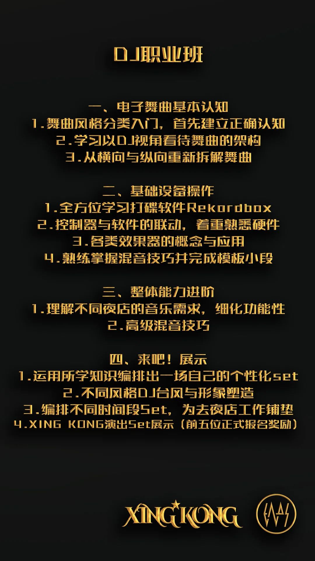 课程质量上升了不止一支半节,对XING KONG老师自身而言,时间成本高了也不是一星半点,所以价格的调整自然可想而知了;同时因为所有DJ设备和软件都已升级至最新,DJ职业班的收费也不得不进行一定幅度的上涨(否则就要亏本)。三种课程的详细价格、培训内容以及课时安排在图中均有陈述,请自行获取。