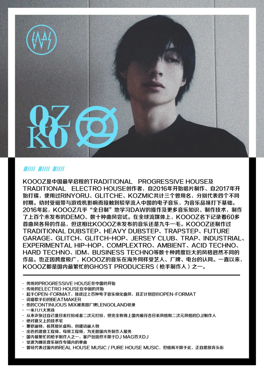 KOOOZ是中国最早启程的Traditional Progressive House及Traditional Electro House创作者,自2016年开始唱片制作、自2017年开始打碟,使用过Rinyoru、Glitche、KOZMIC共计三个曾用名,分别代表四个不同时期。幼时受磁带与游戏机影响而接触到较早流入中国的电子音乐,为音乐品味打下基础。2016年起,KOOOZ几乎“全日制”地学习DAW的操作及更多音乐知识、制作技术,制作了上百个未发布的Demo、数十种曲风尝试。在全球流媒体上,KOOOZ名下记录着60多首曲风各异的作品,但这相比KOOOZ未发布的音乐还是九牛一毛。KOOOZ还制作过Traditional Dubstep、Heavy Dubstep、Trapstep、Future Garage、Glitch、Glitch-Hop、Jersey Club、Trap、Industrial、Experimental Hip-Hop、Complextro、Ambient、Acid Techno、Hard Techno、IDM、Business Techno等数十种跨度巨大的风格迥然不同的作品。也正因跨度极广,KOOOZ的音乐在海外同样受艺人、厂牌、电台的认同。一直以来,KOOOZ都是国内最繁忙的Ghost Producers(枪手制作人)之一。· 传统的Progressive House在中国的开始· 起于Open-Format,挑战过上百种电子音乐细化曲风,且正计划回归Open-Format· 他的Continuous Mix被英国厂牌Lengoland收录· 从未声张过自己是日系打扮或者二次元打扮,但完全称得上国内最符合日系风格和二次元风格的DJ/制作人· 出色的混音工程师、母带工程师,为无数国内外制作人服务· 国内最繁忙的枪手制作人之一,客户包括但不限于DJ Mag百大DJ· 曾经代表过国内的Real House Music / Pure House Music,但格局不限于此,正自愿放弃头衔