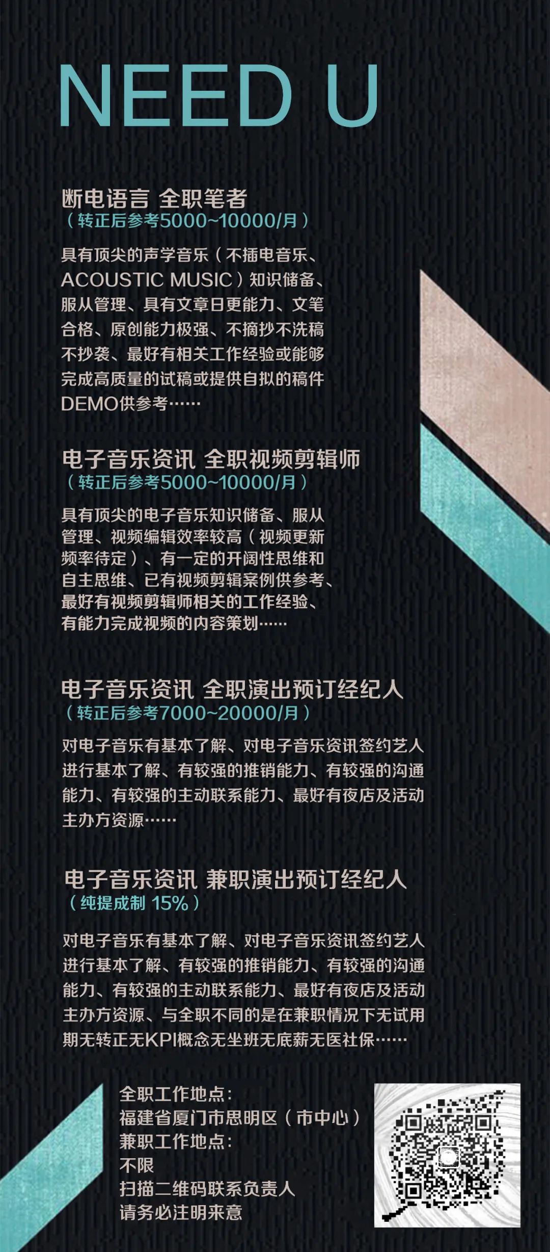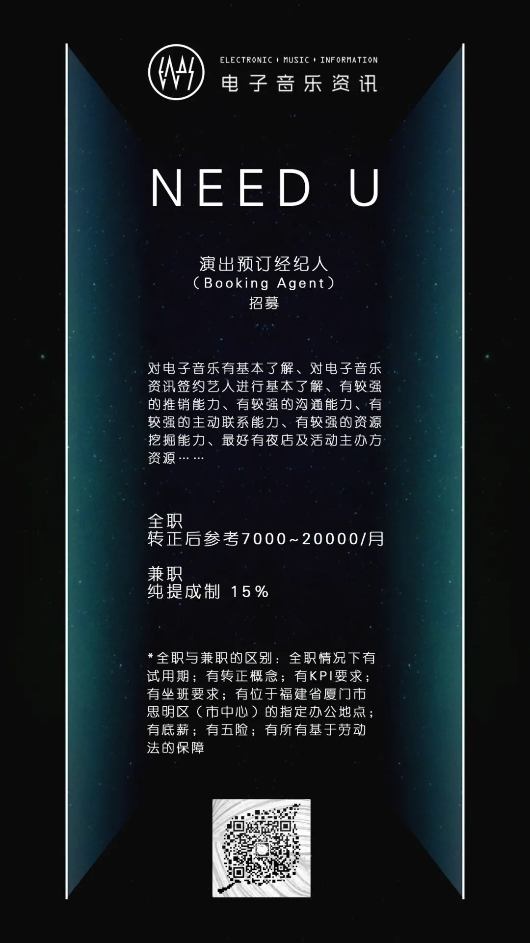 ⒊“电子音乐资讯”品牌的演出预订经纪人(全职):需要对电子音乐有基本了解、对电子音乐资讯签约艺人进行基本了解、有较强的推销能力、有较强的沟通能力、有较强的主动联系能力、最好有夜店及活动主办方资源等等。全职情况下有试用期;有转正概念;有KPI要求;需坐班;底薪+提成薪酬制度;有五险等有所有基于劳动法的保障。详见原文——《我们正在寻觅有潜力的Booking Agent》。