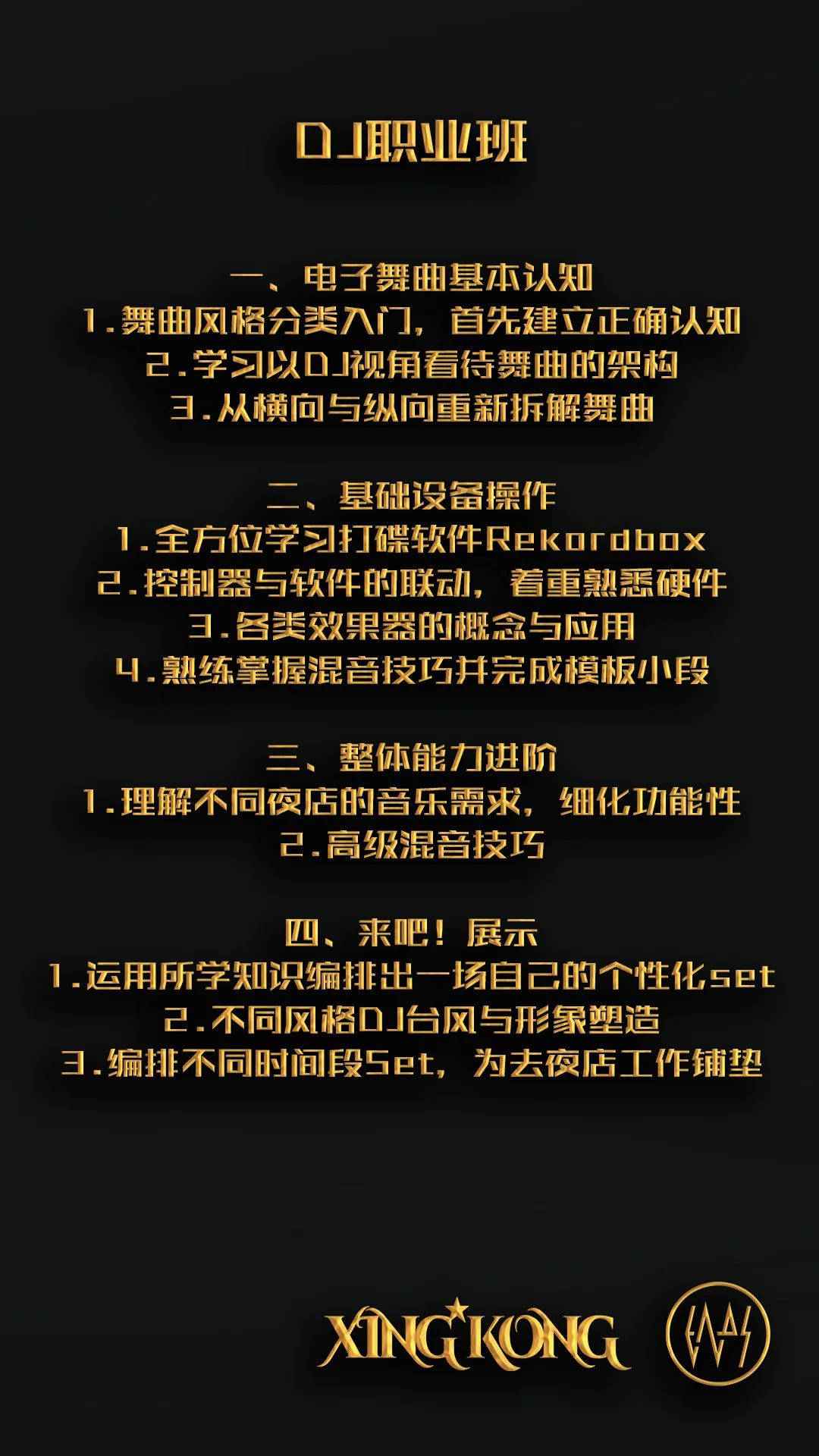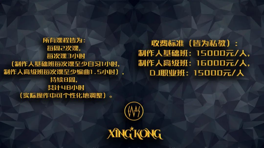 同时,为了招揽更多更高质量的人才、尽快恢复公司业务,我们另采用行业引荐的招募方法——无论你是夜店从业者或是电音爱好者,将我们招聘的岗位推荐给身边的朋友,成功引荐并转正后即可享受XING KONG老师培训课程的九折优惠,在整个课程阶段有效(一次课程阶段约两个月),详细的课程信息见下图。