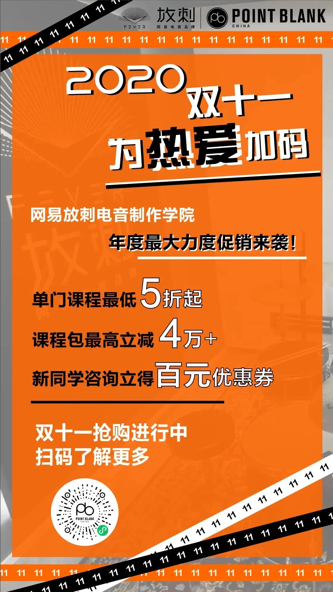 Yysy确实,作为一名电子音乐爱好者,尤其是“Music Is My Life”常挂嘴边的狂热爱好者,学习音乐制作或者DJing是终究要面对的选择。笔者自2016年就萌生了学习制作的想法,但种种原因未能付诸实施。直到四年后来到“电子音乐资讯”,在真香中上课,开始弥补四年前的遗憾。现在,最适合电子音乐爱好者的双十一福利已经到来——网易放刺电音制作学院年度大促活动——电子音乐爱好者以最低的成本享受最国际化的教学水准并蜕变为电子音乐制作人/DJ的绝佳时机。放刺电音制作学院,网易旗下电音品牌“放刺FEVER”与全球最具影响力的电子音乐学院之一Point Blank合作建立的Point Blank China,作为Point Blank在中国开设的唯一授课点,学院在硬件设施和教学师资上保持与Point Blank一致的全球顶尖水平,其国际性和专业度不言而喻。放刺电音制作学院的实体位于杭州国际博览中心有着包括网易云音乐等全方位的资源(下图为网易CEO丁磊到访学院),帮助学员在DJing和音乐制作两大技能上充分开发自身潜能,快速踏上职业化道路。正如大多优秀的制作人都是DJ,虽然这是两门技能、两种职业,但二者兼备则拥有“1+1>2”的效果。放刺电音制作学院的此次活动中优惠力度前所未有,如新老学员最低至五折、课程包最低立减四万多元、线下送五百元的立减券等等。在这个人人都是“尾款人”的双十一,最理性的“剁手”方式莫过于投资自己的未来和梦想。了解课程详情和活动优惠等更多信息请识别下图小程序或点击文末左下角「阅读原文」,也可以扫码添加微信客服直接咨询。