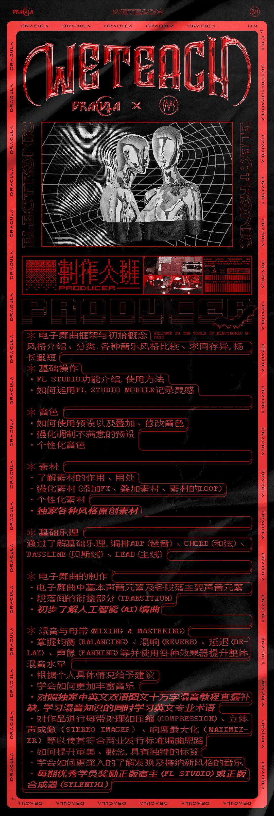 仔细阅读下文的各课程大纲,你会发现Dracula的教学内容较同行之丰富与复杂,这正是高于市场普通价格的原因所在。如在制作课程中,Dracula会教你制作个性化音色从而打造专属自己的“记忆点”,会培养你符合国际化商业发行标准的编曲思路,会教授十分前卫却又是大势所趋的人工智能(Artificial Intelligence)编曲技术等等,并以正版宿主和各种合成器奖励营造的竞争教学氛围、激励学员。