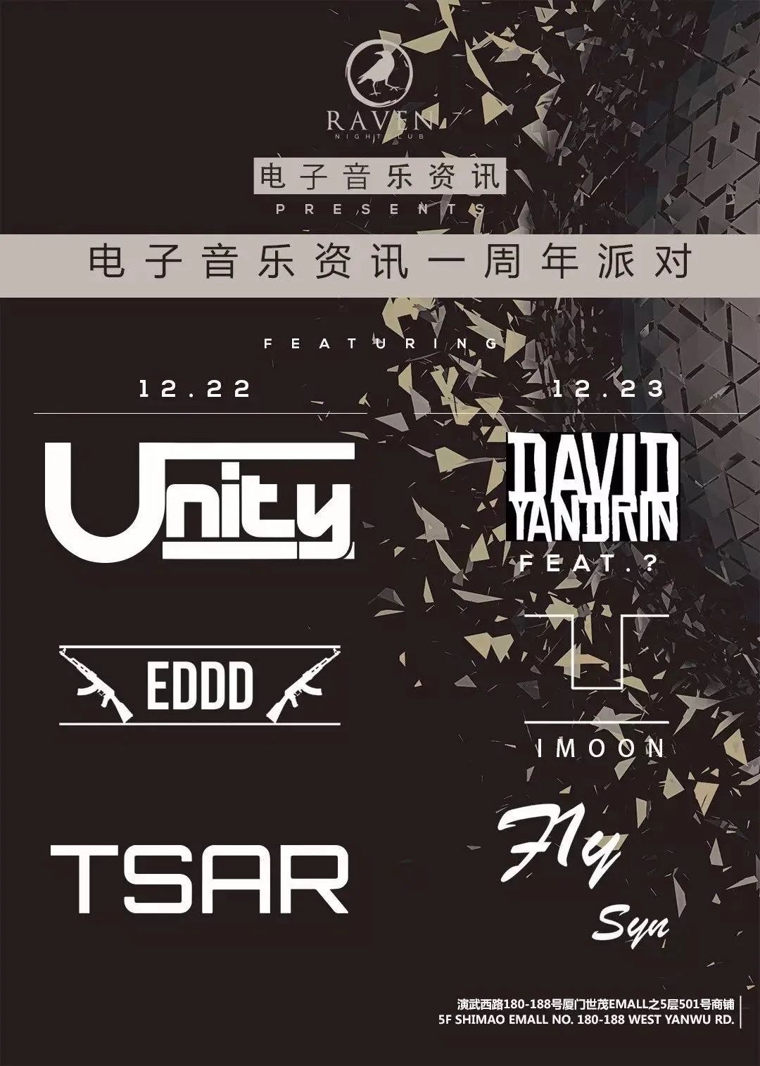 回顾,2016年12月22日~23日,「电子音乐资讯一周年派对」于厦门当时的冠军夜店Raven Nightclub举办,主办形式即由电子音乐资讯和Raven共同呈现。