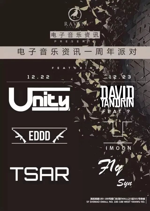 在线下场景方面,电子音乐资讯不仅举办过一周年派对、电子音乐资讯两周年派对、电子音乐资讯三周年派对和Code Future仓库派对等,更通过Booking Agency的方式达成了人气爆棚的电子音乐资讯四周年巡演以及其它跨界商演,将Virtual Riot、Terror Bass、Bare Noize等国外电音大牌DJ/制作人的首次引进中国。图片来自G**gle Images 图片版权属于原主2019年4月,在电子音乐资讯增设艺人管理、唱片发布等业务后,与XING KONG、Yaakov、KOOOZ、KB5、Dracula建立了包括预订经纪、艺人管理、唱片厂牌等业务的独家360 Deal(全方位合约)签约关系,且仅在2019年期间,电子音乐资讯便为签约艺人争取到超过60场表演预订。