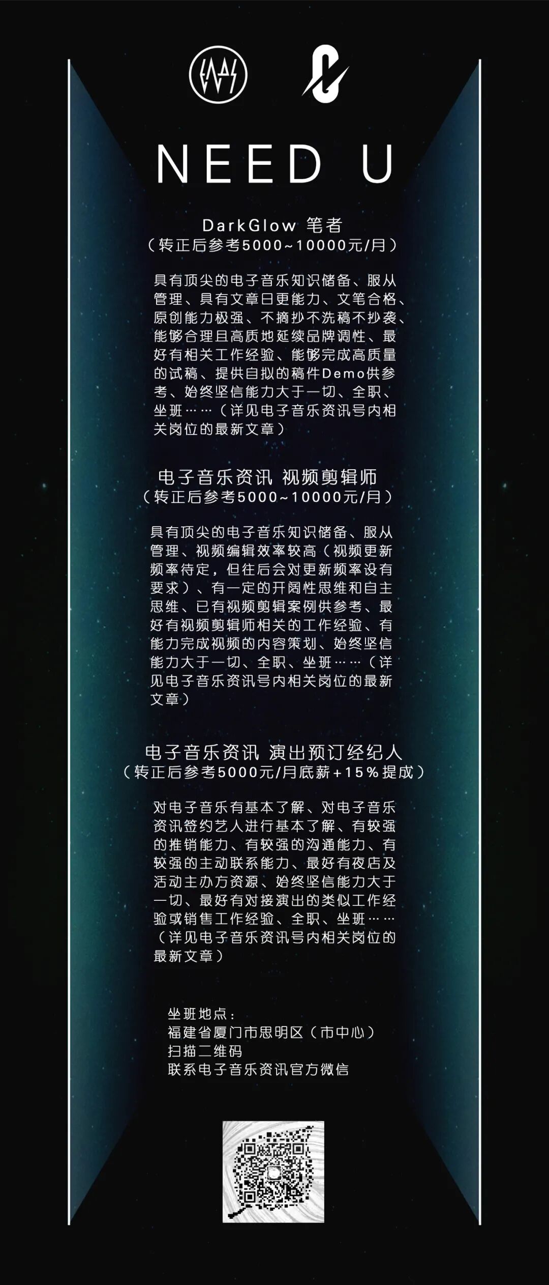 DarkGlow 笔者(转正后参考5000~10000元/月)具有顶尖的电子音乐知识储备、服从管理、具有文章日更能力、文笔合格、原创能力极强、不摘抄不洗稿不抄袭、能够合理且高质地延续品牌调性、最好有相关工作经验、能够完成高质量的试稿、提供自拟的稿件Demo供参考、始终坚信能力大于一切、全职、坐班……(详见电子音乐资讯号内相关岗位的最新文章)电子音乐资讯 视频剪辑师(转正后参考5000~10000元/月)具有顶尖的电子音乐知识储备、服从管理、视频编辑效率较高(视频更新频率待定,但往后会对更新频率设有要求)、有一定的开阔性思维和自主思维、已有视频剪辑案例供参考、最好有视频剪辑师相关的工作经验、有能力完成视频的内容策划、始终坚信能力大于一切、全职、坐班……(详见电子音乐资讯号内相关岗位的最新文章)电子音乐资讯 演出预订经纪人(转正后参考5000元/月底薪+15%提成)对电子音乐有基本了解、对电子音乐资讯签约艺人进行基本了解、有较强的推销能力、有较强的沟通能力、有较强的主动联系能力、最好有夜店及活动主办方资源、始终坚信能力大于一切、最好有对接演出的类似工作经验或销售工作经验、全职、坐班……(详见电子音乐资讯号内相关岗位的最新文章)