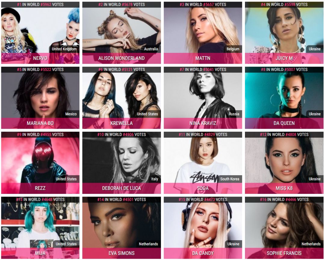 但你要知道的是,不仅百大DJ排行榜有无数个版本,百大女DJ排行榜也至少有十几家媒体进行评选。每个媒体经过他们的粉丝投稿以后,最终结果均不尽相同。例如“英国被碰瓷媒体”,就在昨天宣布了2018年百大女DJ排行榜的结果。