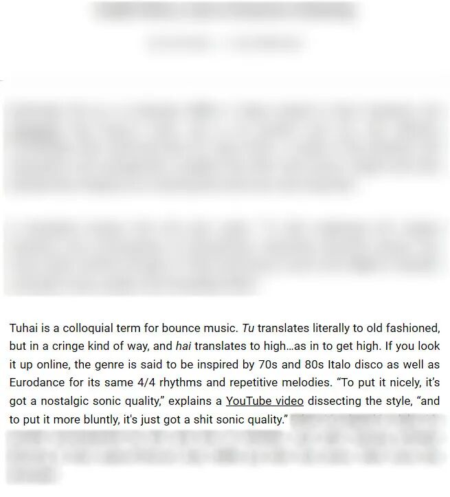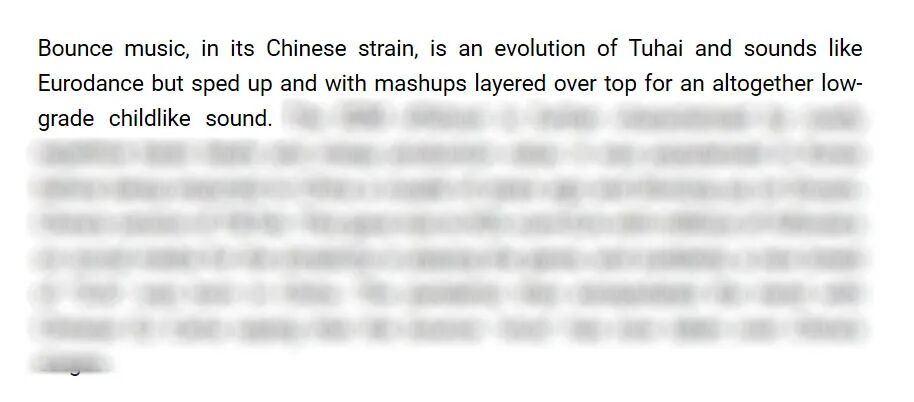 图片来自朋友圈 图片版权属于原主该英文文章的主题思想是通过讲述关于中国包括(部分)Bounce在内的“土嗨”音乐和夜店非健康场景以及人们对它的抵制来传播正能量。但其中有一句“Bounce是土嗨音乐的进化版,听起来像是Eurodance加快并Mashup……”的严重误导性笔者不得不提。