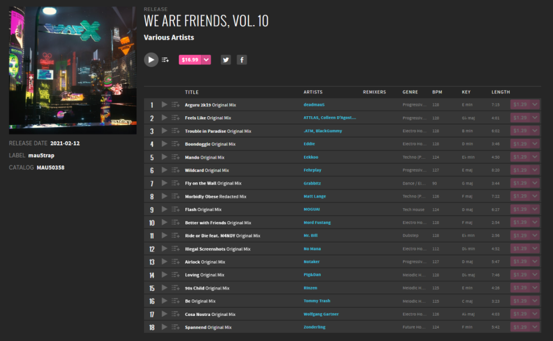 自2012年加拿大行业大老板deadmau5的厂牌mau5trap首次发行《We Are Friends》起,便开启了该合辑系列平均每年一次的重磅“连载”。近年来,作为mau5trap厂最热推的合辑(没有之一),每年年底或年初的发行于粉丝而言就像追剧一样受人期待和青睐。