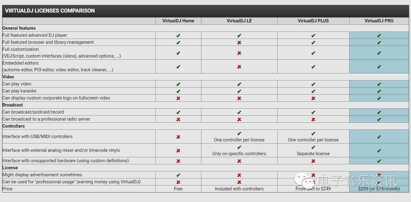 那么这篇文章的主要目的就是洗白Virtual DJ,消除大家的偏见。并且告诉你区别。我们先要搞明白VDJ并不是一款免费的软件,你认为它是免费的因为你用的是破解版。正版比Rekordbox DJ/Serato DJ/Traktor PRO还要昂贵。所以如果你以“不值钱”来瞧不起它,那你不仅错得离谱,还颠倒了黑白。Virtual DJ一共有四种版本,而PRO的售价为299美金,折合人民币1990元。