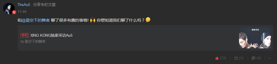 2020年底至2021年初最影响XING KONG的职业生涯的步骤之一,是如愿以偿地独家采访了对其影响深刻的异国知音Au5;