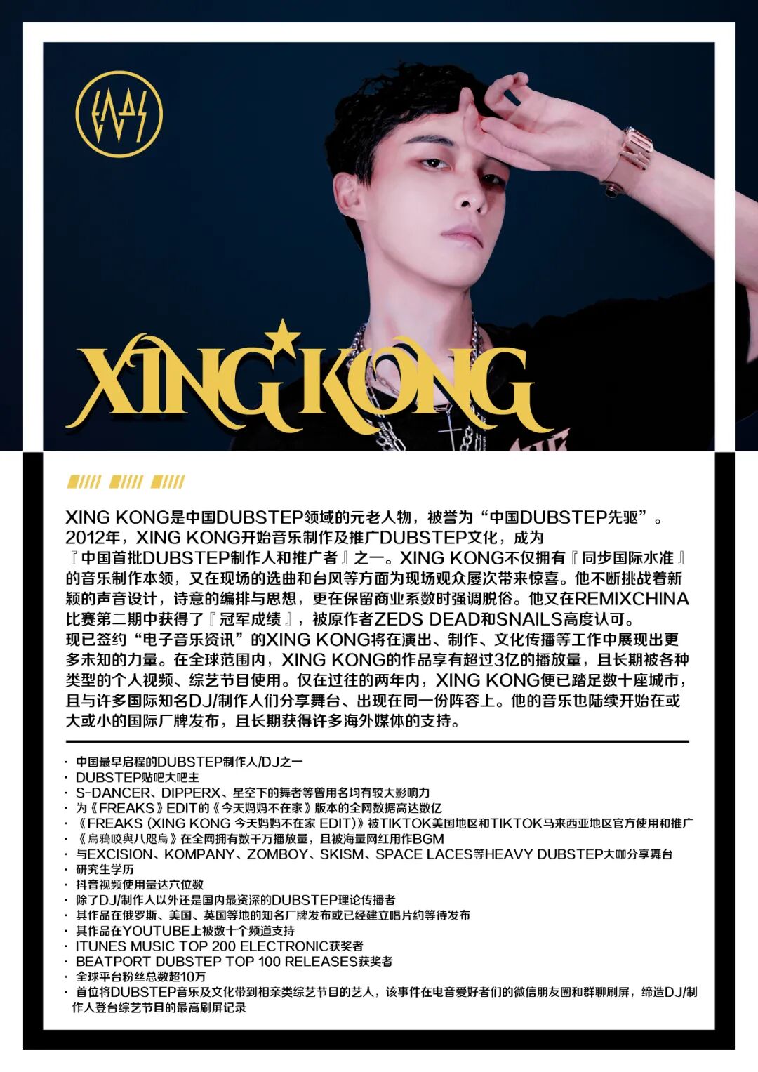 XING KONG不仅拥有同步国际水准的音乐制作本领,又在现场的选曲和台风表现出了不俗的天赋。XING KONG前后出现在不同城市的夜店、仓库派对和音乐节登台献艺,期间甚与Excision、Kompany、Zomboy、SKisM、Space Laces等国际顶尖人物分享舞台、成为这些Headliners的特邀Support,以狂暴的台风赢获Raver们的喜爱。