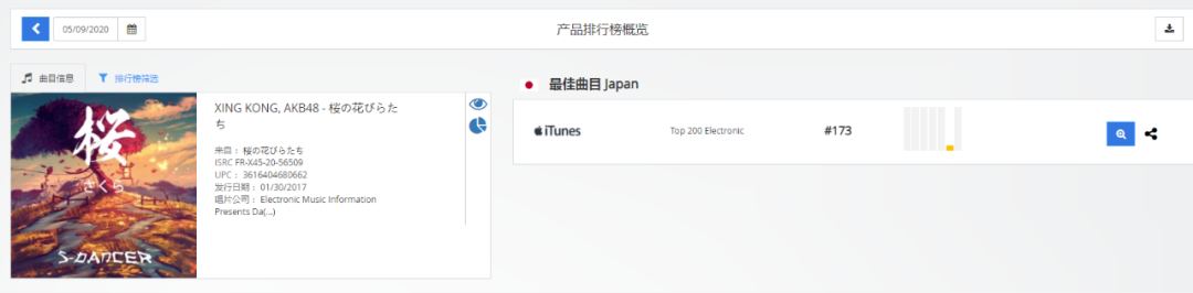2020年5月9日,《桜の花びらたち (XING KONG Bootleg)》荣登iTunes Music日本地区的“Top 200 Electronic”排行榜。