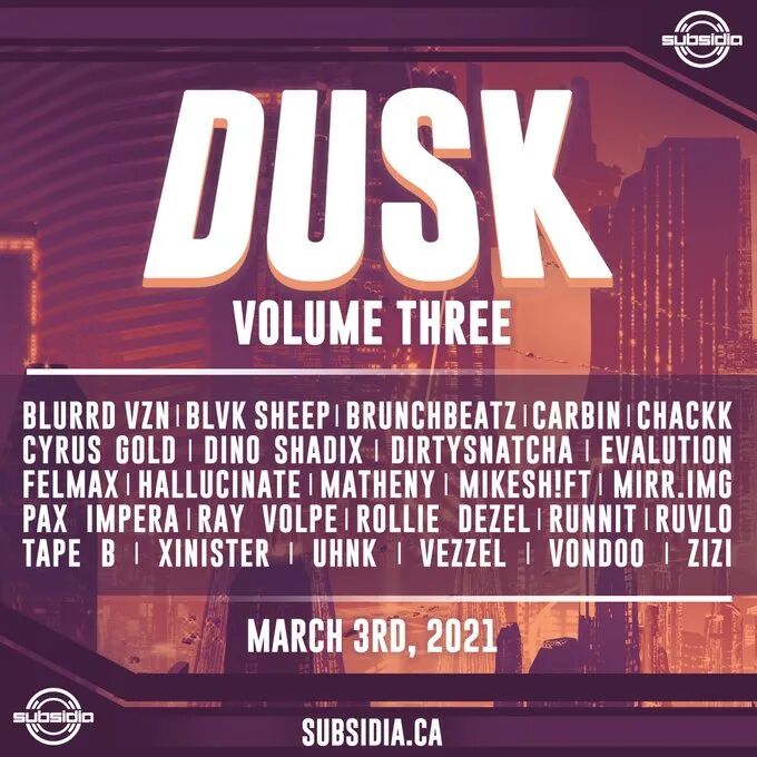 此前,三种合辑各自均发行至第二期(Vol. 2),而就在今天,三种合辑中最具前瞻性的“Dusk”系列释出第三期《Subsidia Dusk: Vol. 3》,内含17首曲目,其音乐类型及音乐类型元素(整张专辑而非每首曲子)所涉及的风格有Deep Dubstep、Leftfield Bass、Hybrid Trap、Colour Bass、Melodic Riddim以及Future Riddim等。
