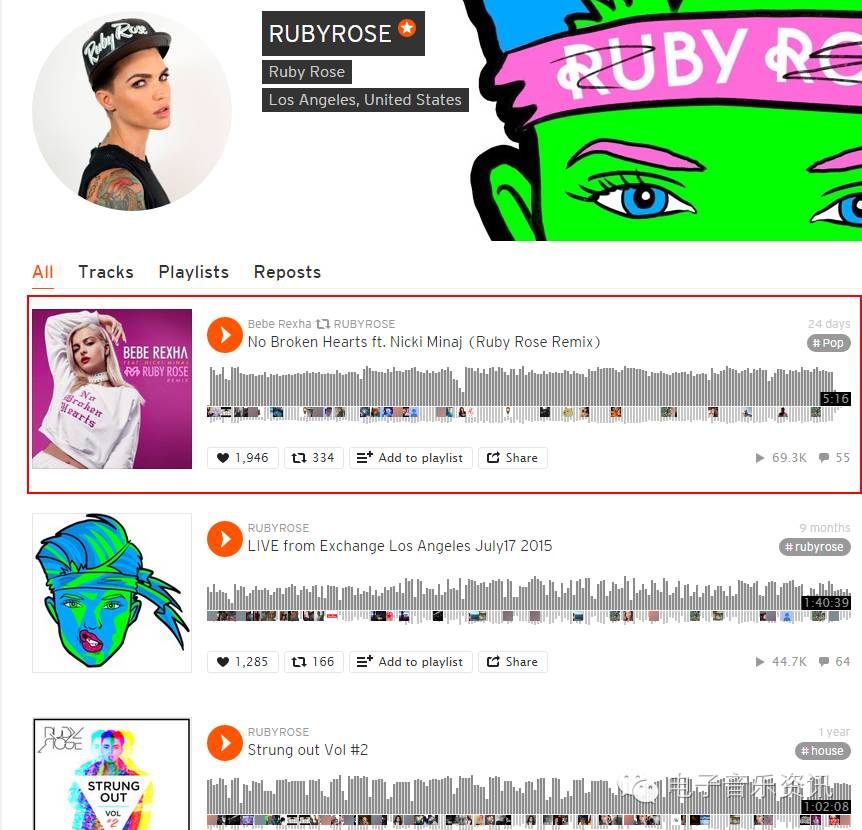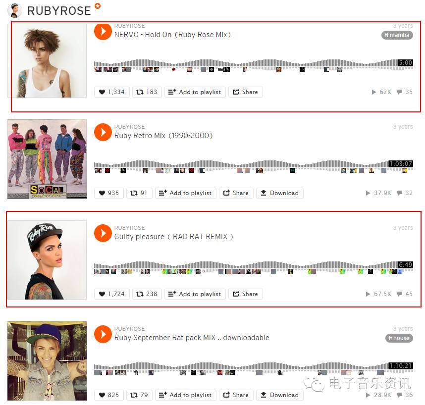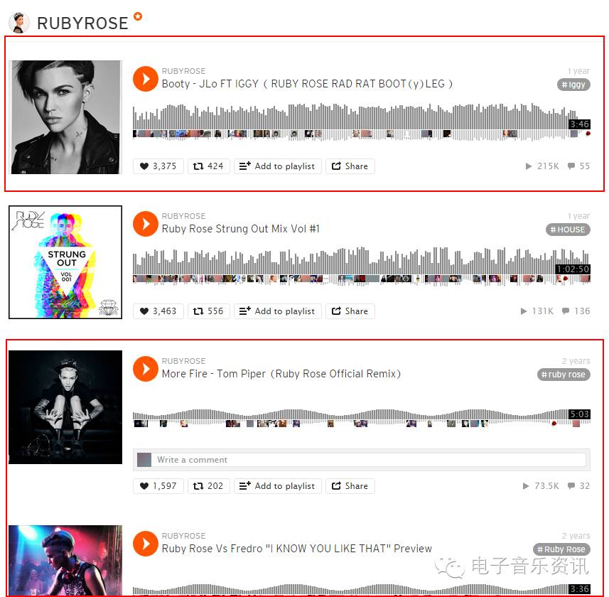 再来看看她的Soundcloud。红框的是单曲,其它的是串烧(什么是“set”?反正不是串烧。):