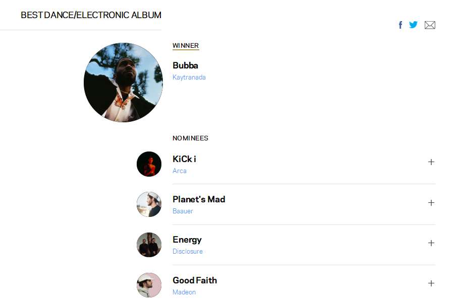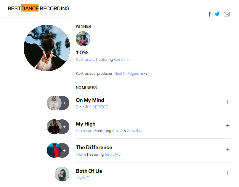 如我们所看到的,海地裔加拿大新锐DJ兼制作人Kaytranada横扫两大舞曲类奖项——以其2019年的第二张录音室LP专辑《BUBBA》赢得了最佳舞曲/电子专辑奖,并以《BUBBA》中的与美国女歌手合制的《Kaytranada Featuring Kali Uchis - 10%》拿下最佳舞曲录制奖(指其中的单曲)。