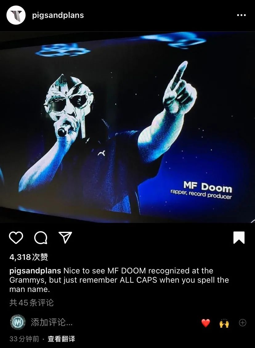此外,格莱美在致敬逝去的说唱艺人MF DOOM(ALL CAPS)时,也(被媒体指控,但并非电子音乐资讯指控)并未尊重其生前本意的艺名全大写要求。(虽然我们电子音乐资讯在微信公众平台和如今不主推的其它平台之前也是…但后来都尽可能在按MF DOOM的官方“文风”走)