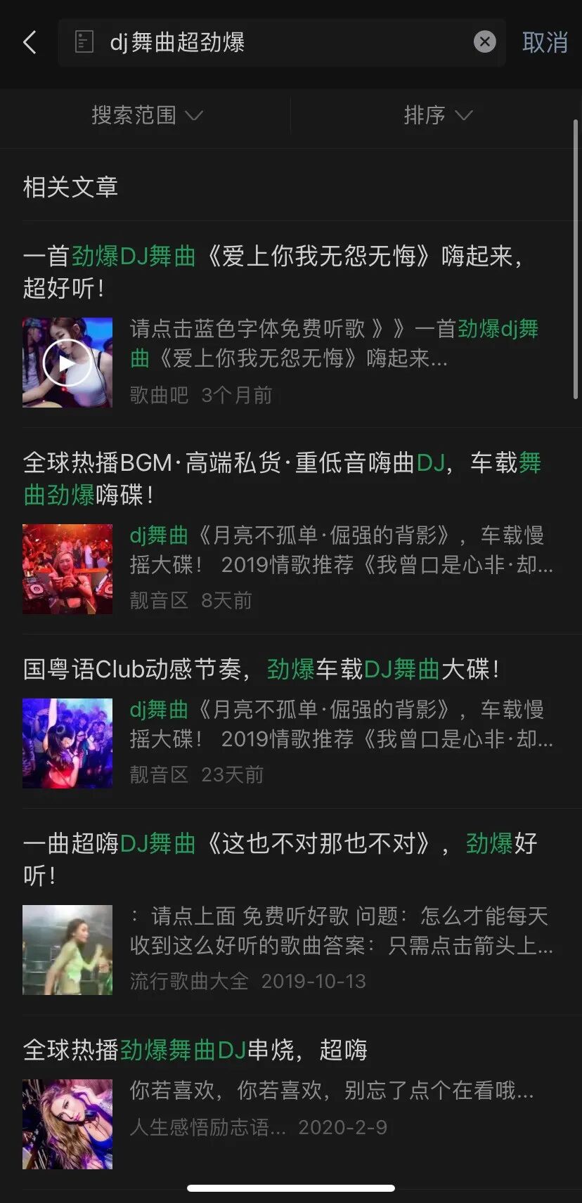 然后呢……在教完方式方法后,我们亲自试了一下,刚刚输入“DJ”两个字,就蹦出了一个全新的比较“ElectronicNegative-Style”的选题:《微信公众平台也已经被土嗨攻陷了》,五大热搜关键词,分别是:⒈“DJ舞曲超劲爆”、⒉“DJ Soda”、⒊“Django”、⒋“DJ歌曲”、⒌“Dji Fpv”,好家伙,不愧是电音倒车元年!(见下图)