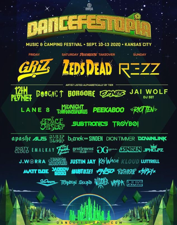 2021年4月7日,Dancefestopia再次释出了最新(第二波)阵容,并宣布于2021年9月9日至12日举行,为期四天三夜。在下图这一对于美国的Bass小圈子而言可谓是全明星阵容中,我们看到三位头牌Griz、Zeds Dead和Rezz,著名的“次头牌”和嘉宾DJ如Borgore、Au5、Wreckno、GG Magree、1788-L、Kloud等等。