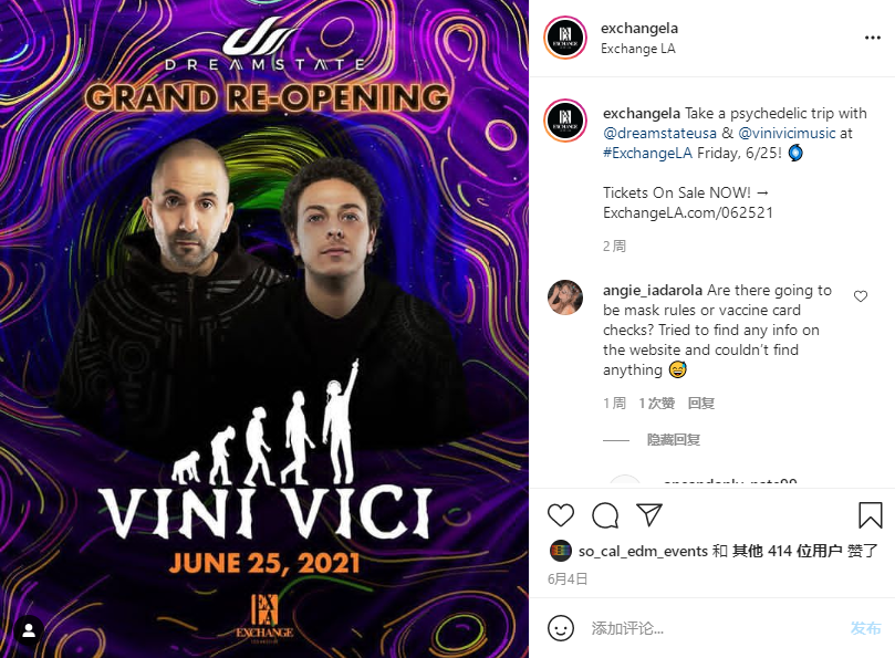 值得一提的是,之前《电子音乐资讯》和《DarkGlow 暗芒》介绍的美国电音场景回归大多是(电子)音乐节的回归,而今日推文的“LA Is Back”主要是指俱乐部派对,读者们请注意区分,对比之后我们也可以看到当前美国的复苏进度——不仅(电子)音乐节市场和仓库派对(或营销称“室内电音节”)市场多次放出好消息,现在俱乐部也正以极快的效率恢复起来。