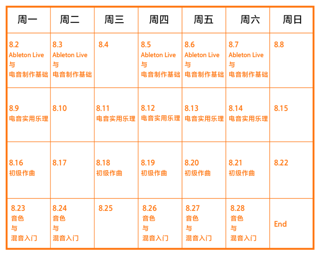 (宿主),从乐理学习到创作思路、再到混音技巧,通过一个月(四周)的系统课程让学员从零基础的普通电子乐迷进阶为专业的音乐制作人,从而拥有创作属于自己电音作品的能力。