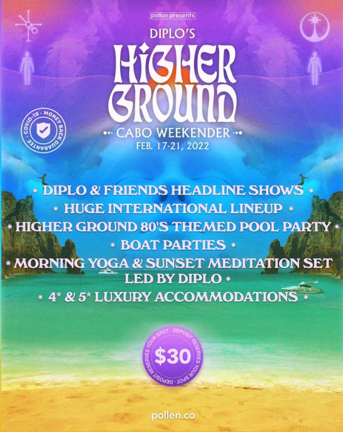 和“Justin Bieber & Friends”一样,Pollen与Diplo于墨西哥合作呈现的Higher Ground Cabo阵容中也不乏Diplo的大量DJ/制作人“朋友”。2022年2月17至2月21日,Diplo将带领Duke Dumont、Melé、Gorgon City、Sonny Fodera、GW Harrison、VNSSA以及二人组合MANT等等各国DJ兼制作人一同打造连续四天的Techno、House以及Tech House风格的派对。