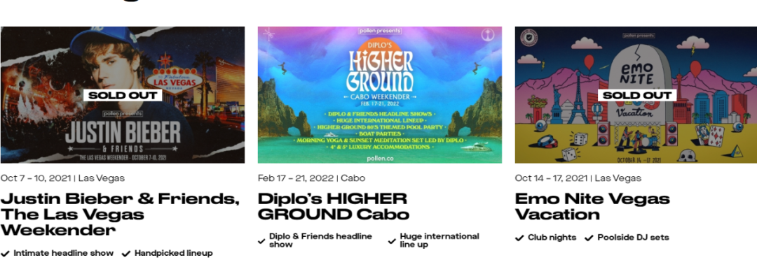 详细说之,Pollen的业务领域覆盖音乐活动、体育赛事、娱乐项目、旅行度假等,仅说音乐活动的流派就不限于电子音乐、嘻哈音乐、雷鬼音乐等等,在Pollen平台你还可以查看各大音乐节的阵容并预定门票,而前往目的地过程中的机酒(机票、酒店这样的附加“成本”)预定大都可以通过Pollen来全套完成。