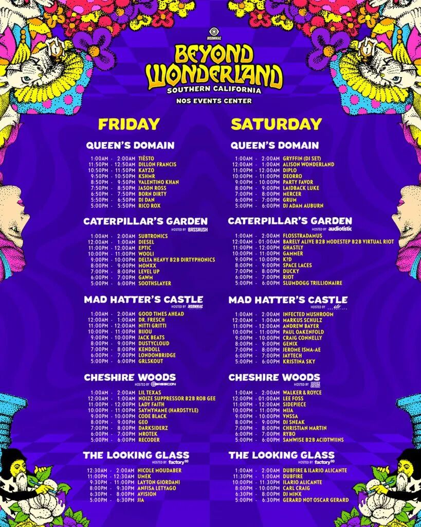 Beyond Wonderland SoCal作为Insomniac旗下Beyond Wonderland“主站”(Ps:注意Socal的意思)级别的活动,艺人阵容不言而喻,DJ/制作人巨星有Tiësto、Diplo、KSHMR、Deorro、Paul Oakenfold等等,同时Beyond Wonderland SoCal也是Alison Wonderland回归演出后参加的第一场美国大型电音节。