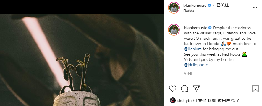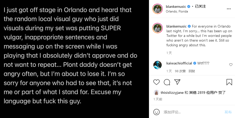 比如前几天,在美国佛罗里达州ILLENIUM的“Fallen Embers Tour”的演出上,其来自(大洋洲的)澳大利亚的好友、Mid-Tempo (Bass)(及其它Mid-Tempo)和Dark Glitch-Hop、New-School Glitch-Hop代表DJ兼制作人(之一)Blanke就因为VJ的问题遇到了一件让他心情糟糕的事情,导致他在自己的不止一个海外社交平台上进行多次吐槽。