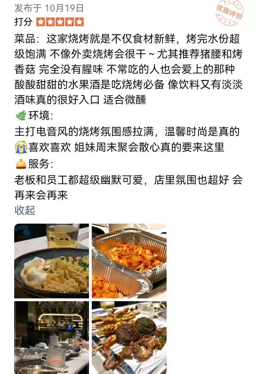 图片来自Dainasint 图片版权属于原主 固然,DJ Mag Top 100 DJs的魅力之大让众人梦寐以求,但并非所有的DJ兼制作人的梦想都是登上该榜,而且,在实现这一目标与梦想后,你也许会发现,随波逐流地“上榜”并不是那么地重要,职业生活中还有更多更有意义的跨界 / 跨行工作待电子音乐艺人去尝试与体验。 图片来自Rave Jungle 图片版权属于原主 这不是“吃不到葡萄说葡萄酸”,这正是中国(中国籍,华裔另计)首位DJ Mag Top 100 DJ——DJ L的变化过程。自从2017年、2018年连续上榜之后,DJ L就长期被国内电音爱好者所关注,而在其后的2019年、2020年以及DJ Mag Top 100 DJs 2021刚刚揭晓之后,许多电子乐迷都在问:DJ L怎么没上榜?之前多次有读者在《电子音乐资讯》文章评论区问到“前百大DJ L现在怎么样了?”,故本的选题也是一次对读者们好奇、疑问的响应。 图片来自DJ L 图片版权属于原主 事实上,DJ L早已没有参加DJ Mag Top 100 DJs的竞选,所以也压根谈不上“没上”、“落榜”的说法。取而代之的是,DJ L把时间投入至自己认为更感兴趣、更具意义的事情 / 事业之中。 图片来自DJ L 图片版权属于原主 根据笔者的了解,DJ L在日常生活中有着两大爱好,第一是滑雪运动,此前《电子音乐资讯》也报道了以DJ L为代表的滑雪电音节Electric Ski Carnival阵容;而今天,我们主要聊聊DJ L的第二大爱好——烧烤。 图片来自DJ L 图片版权属于原主 和大多数“吃货”一样,DJ L不仅自小就爱吃烧烤,他还像制作电子音乐一样也学会了“制作”各类颇具风味的烧烤美食,每当下班或者完成高强度地演出之后感到疲惫时,DJ L就通过一顿烧烤让自己满血复活,毕竟我们知道,“没有什么问题是一顿烧烤解决不了的”。 图片来自Instagram 图片版权属于原主 2021年10月18日,也就是本周一,DJ L创立的一家烧烤店“0分串吧”正式开业,其坐落于上海市徐汇区襄阳南路498号,在这里,有来自不同城市、多种口味的套餐,“0分串吧”一经开业就迎来如潮的好评,其中,顾客们还特地提到了店里的电子音乐氛围。 图片来自“0分串吧” 图片版权属于原主 的确,美食是其次,电子音乐才是更受电子乐迷关注的焦点。“0分串吧”店内装配了KRK (RIP8)音响系统、店外有户外露台供电子乐迷组织Party与跳舞,平时(周日至周四)的晚餐 / 夜宵时间从下午17:30持续至(第二天)凌晨3:30,而每周末(周五、周六)营业时间为下午17:30至(第二天)凌晨4:30。更值得一提是,当兴致来了,老板DJ L甚至会亲自在烧烤店里进行打碟表演。