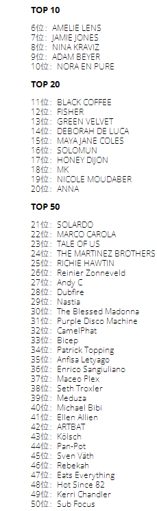 位居DJ Mag Alternative Top 100 DJs第二者依然是英国Techno、House Music老牌传奇人物Carl Cox;而夺得“铜牌”的是德国Tech House、传统Deep House蒙面艺人Claptone;韩裔双国籍的Peggy Gou攀升五位获得今年第四名的佳绩;High-Tech Minimal发明者Boris Brejcha和比利时Techno公主Amelie Lens分别位于第五、第六名,以及(Yi Qing时期不那么活跃的)Jamie Jones和Nina Kraviz分别滑落至第七名、第八名,而Drumcode Records老板Adam Beyer和南非Melodic Tech / Melodic House明星Nora En Pure排在第九名和第十名。